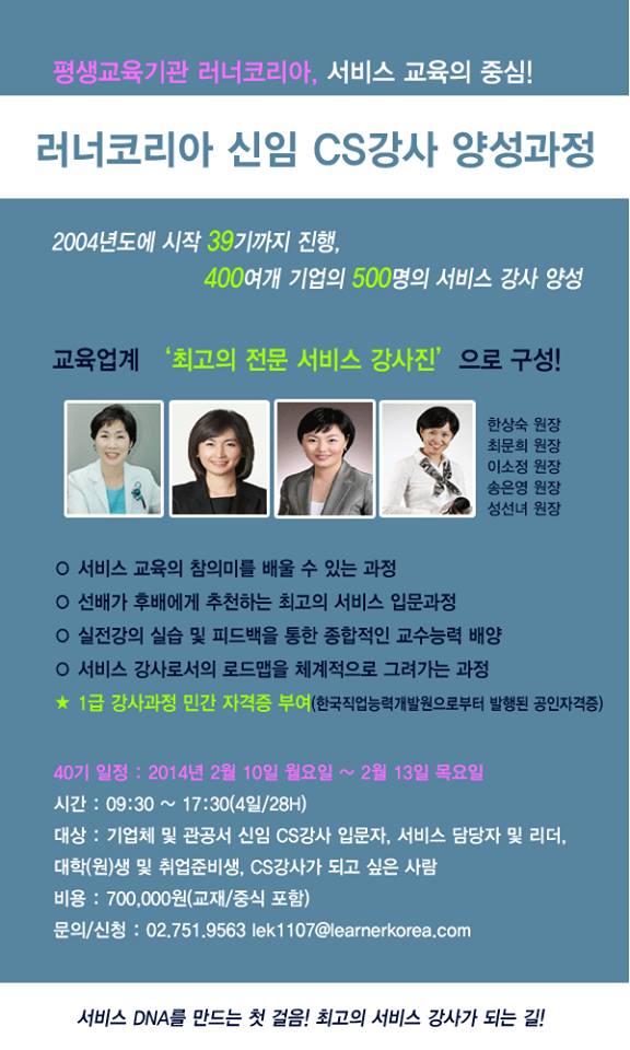러너코리아 CS강사양성과정 1일차 강의 진행 페이지 정보 작성자 (주)퀀텀러닝코리아 작성일2014-02-10 조회555회 목록 본문 2월 10일 러너코리아에서 CS강사양성과정 1일차 교육을 진행하였습니다 목록